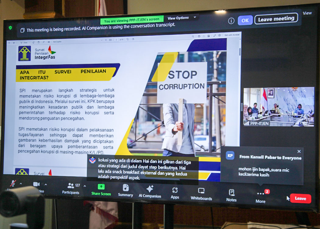 BANDUNG, Kamis 26 Juni 2025 – Sesuai dengan arahan Kepala Kantor Wilayah Kementerian Hukum Jawa Barat Asep Sutandar yang disampaikan kepada jajarannya. Kanwil Kementerian Hukum Jawa Barat ikuti secara virtual kegiatan Sosialisasi Pelaksanaan Survei Penilaian Integritas (SPI) Tahun 2025 dan Rencana Tindak Lanjut Rekomendasi Hasil SPI Tahun 2024, yang dilaksanakan secara daring dan diikuti juga oleh seluruh unit utama, kantor wilayah, serta jajaran pelaksana di lingkungan Kemenkum.