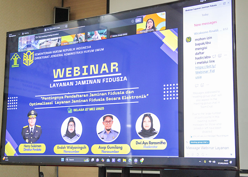 BANDUNG-Berdasarkan arahan Kepala Kantor Wilayah Kementerian Hukum Jawa Barat Asep Sutandar yang diteruskan oleh Kepala Divisi Pelayanan Hukum Hemawati Br Pandia kepada jajarannya. Kanwil Kemenkum Jabar ikuti Webinar Layanan Jaminan Fidusia kepada masyarakat dan pelaku usaha yang diselenggarkan oleh Direktorat Jenderal Administrasi Hukum Umum (Ditjen AHU). Pada hari ini, Selasa pagi (27/05/25) yang bertempat di Ruang Romli Atmasasmita. tampak menyaksikan, Kepala Bidang Pelayanan Administrasi Hukum Umum Ave Maria Sihombing bersama stafnya.