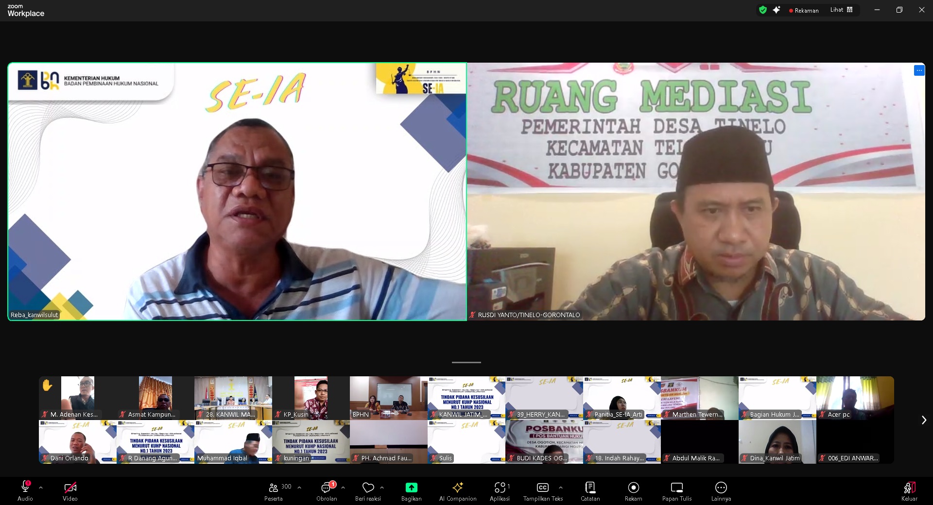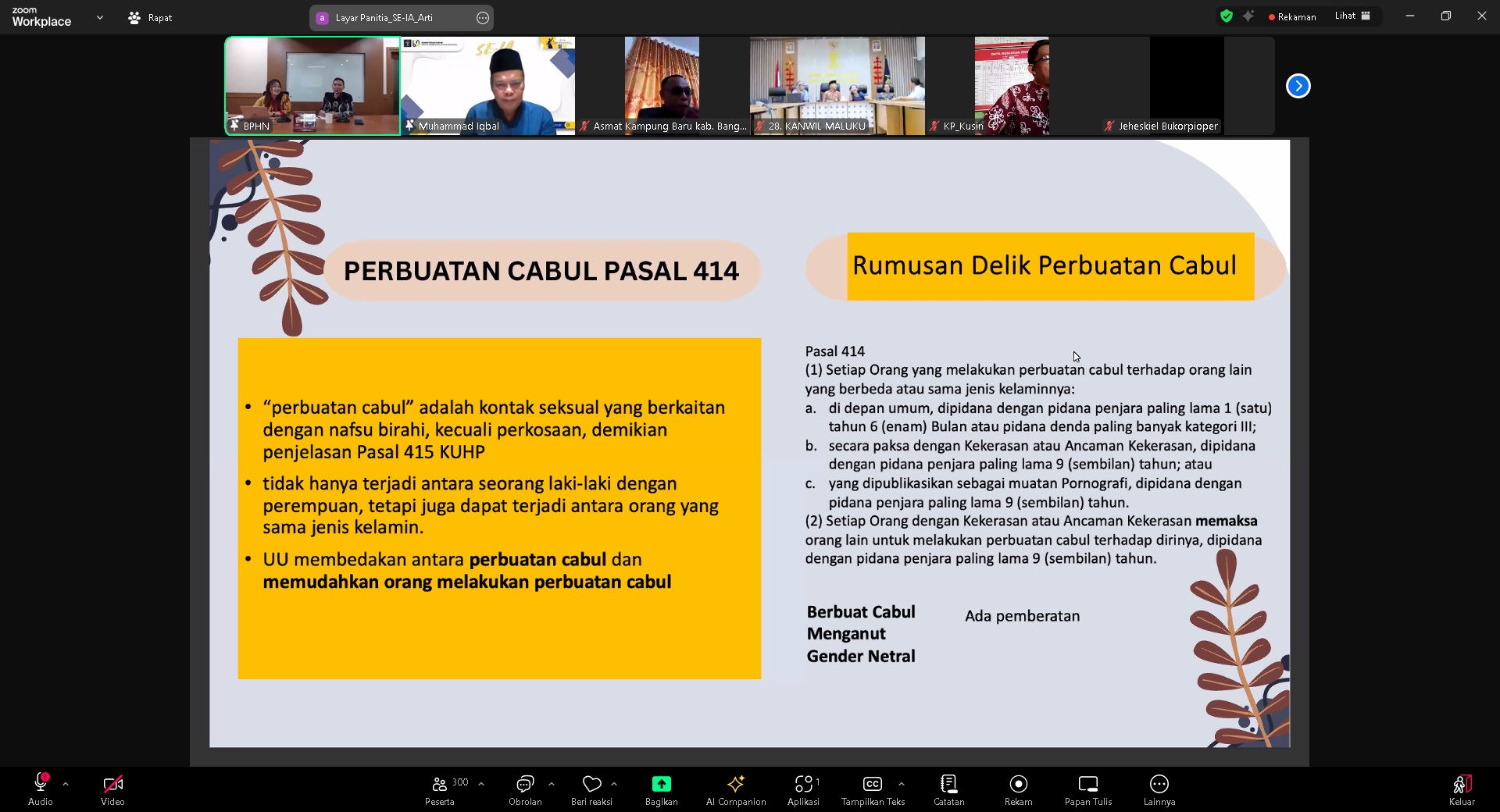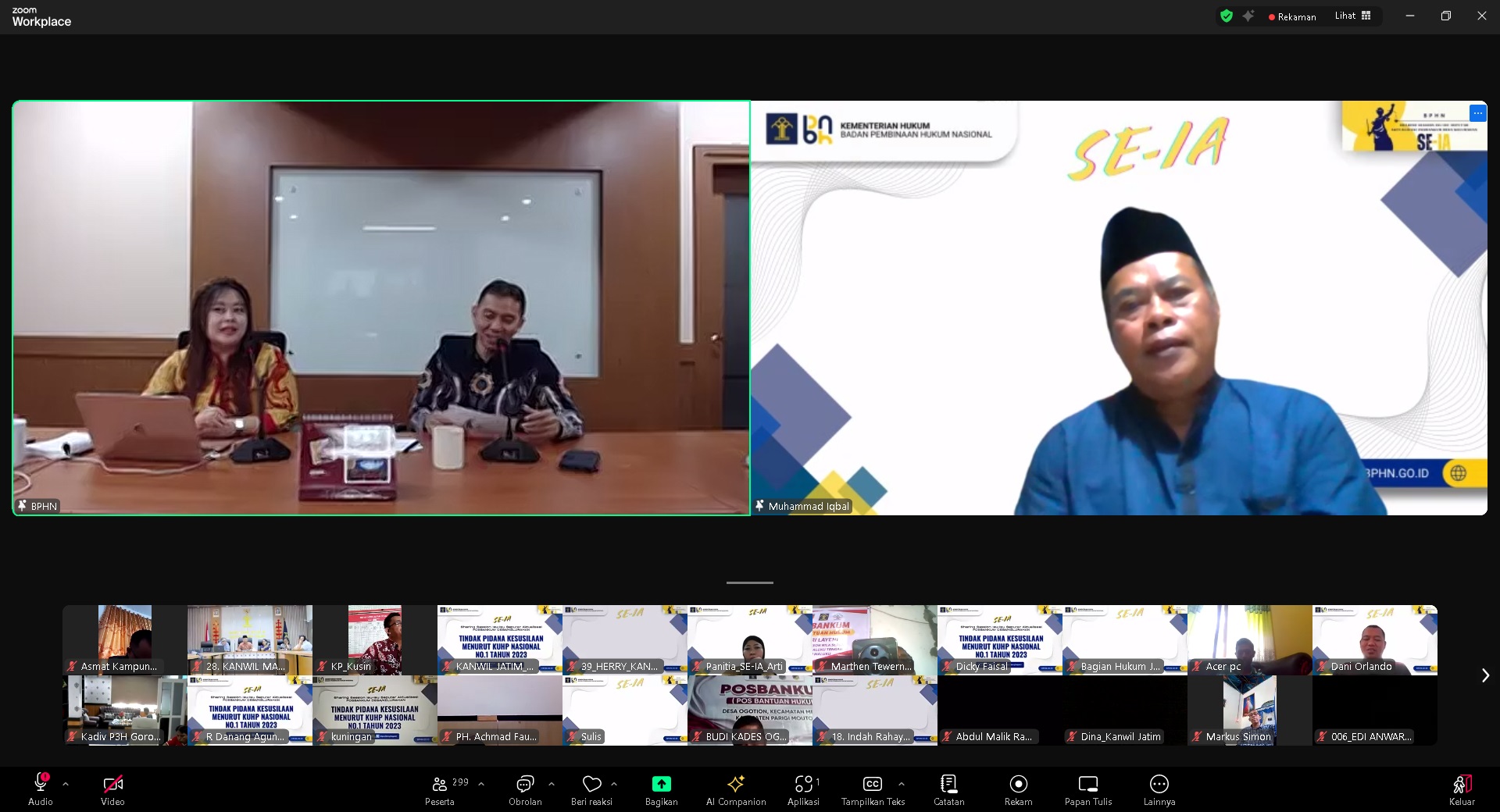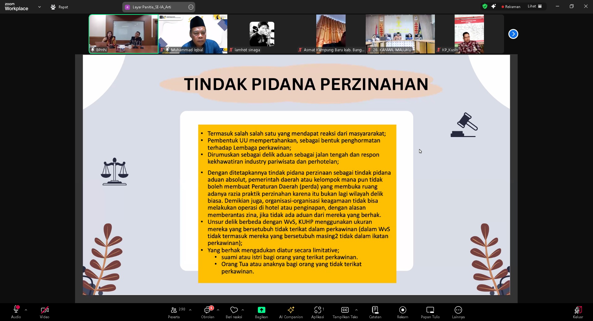 BANDUNG - Menindaklanjuti arahan Kepala Kantor Wilayah Kementerian Hukum Jawa Barat Asep Sutandar yang diteruskan oleh Kepala Divisi Peraturan Perundang - Undangan dan Pembinaan Hukum Funna Maulia Massaile kepada jajarannya, Para Penyuluh Hukum Kanwil Kemenkum Jabar ikuti secara virtual kegiatan yang diselenggarakan oleh Badan Pembinaan Hukum Nasional (BPHN) Kementerian Hukum pada hari Jum’at pagi, 8 Agustus 2025, yaitu program "SE-IA" (Sharing Session Isu-isu Seputar Aktualisasi Posbankum Desa/Kelurahan). Acara yang digelar secara daring melalui Zoom ini mengusung tema krusial, "Tindak Pidana Kesusilaan Menurut KUHP Nasional Undang-Undang No. 1 Tahun 2023", dan diikuti oleh para paralegal dari pos bantuan hukum di seluruh Indonesia.