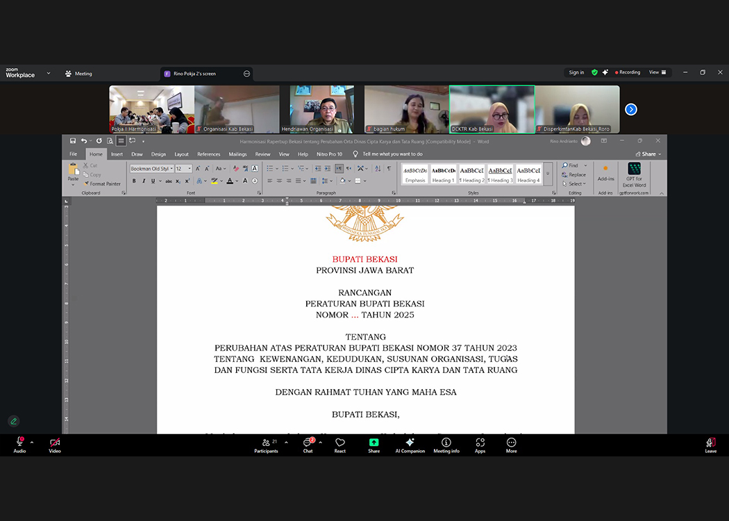 BANDUNG - Tim Kelompok Kerja Harmonisasi 2 Kanwil Kemenkum Jabar bersama jajaran Pemerintah Kabupaten Bekasi menggelar Rapat Harmonisasi untuk membahas 5 Rancangan Peraturan Bupati (Raperbup) Bekasi melalui Aplikasi Telekonferensi, Selasa (18/11/2025). Kegiatan ini bertujuan untuk memastikan kelima Raperbup tersebut selaras dengan peraturan perundang-undangan yang lebih tinggi dan tidak tumpang tindih kewenangan.