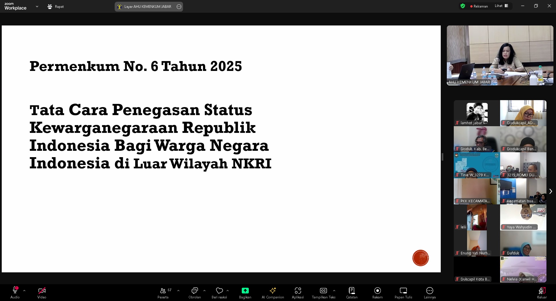 Menutup kegiatan, disampaikan pula bahwa hingga tahun 2025, terdapat lebih dari 53 juta permohonan penegasan status kewarganegaraan yang tersebar di berbagai negara seperti Malaysia, Arab Saudi, Filipina, dan Timor Leste. Pemerintah mendorong percepatan penyelesaian administrasi kewarganegaraan ini sebagai bentuk perlindungan terhadap WNI di luar negeri. Dalam sesi diskusi, peserta diberikan kesempatan untuk menyampaikan pertanyaan dan kendala yang dihadapi di lapangan guna menemukan solusi konkret bersama. Kegiatan ini diharapkan mampu memperkuat pemahaman dan sinergi lintas sektor dalam penyelenggaraan administrasi kewarganegaraan yang lebih efektif dan inklusif.