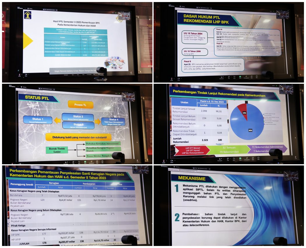 Pemantauan Tindak Lanjut Hasil Pemeriksaan ini disinyalir akan berlangsung selama 5 hari kedepan. Mekanisme perkembangan tindak lanjut harus dilakukan dengan menggunakan aplikasi Sistem Informasi Perkembangan Tindak Lanjut (SIPTL). Entitas diharapkan mengunggah bahan Perkembangan Tindak Lanjut dan Penyelesaian Keruneg melalui link yang telah disediakan. Pembahasan bahan tindak lanjut dan penyelesaian Keruneg dapat dilakukan di Kantor Kementerian Hukum dan HAM, Kantor BPK, dan/atau teleconference.