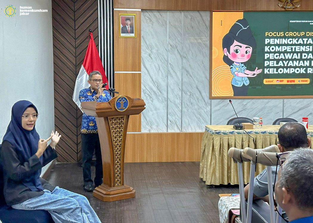 BOGOR-Menindaklanjuti arahan Kepala Kantor Wilayah Kementerian Hukum dan HAM Jawa Barat, Masjuno, Kepala Divisi Pelayanan Hukum dan HAM Jawa Barat, Andrieansjah memerintahkan Kepala Bidang HAM Hasbulah Kantor Wilayah Kementerian Hukum dan HAM Jawa Barat yang ditindaklanjuti oleh Kepala Sub Bidang Pemajuan HAM Yuniarti Kurniasari untuk mengikuti Focus Group Discussion (FGD) Peningkatan Kompetensi Pegawai dalam Pelayanan Publik Ramah Kelompok Rentan.