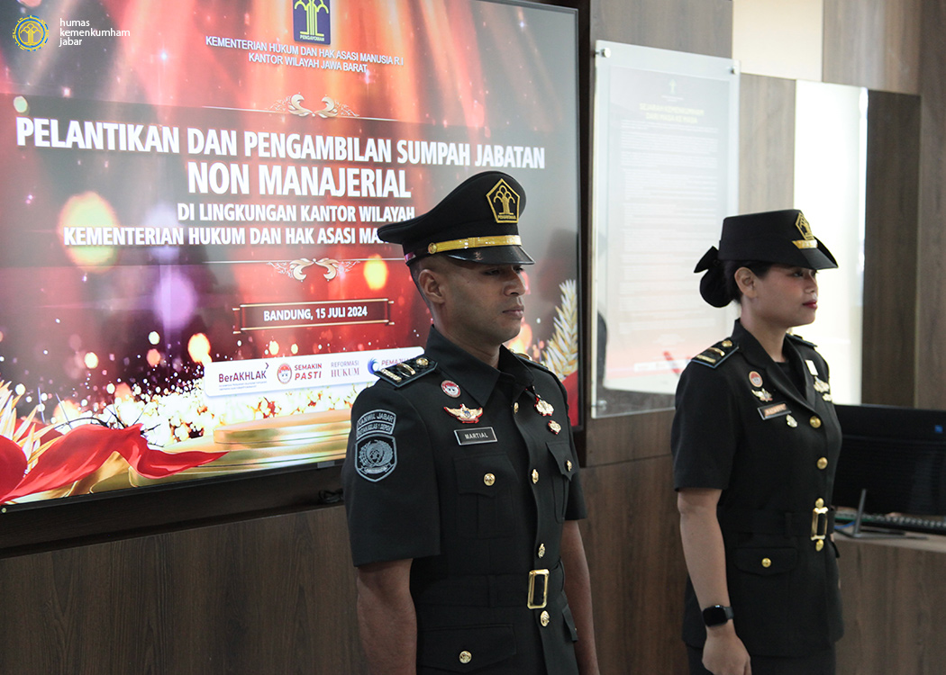 BANDUNG – Kepala Kantor Wilayah Kementerian Hukum dan HAM Jawa Barat (Kakanwil Kemenkumham Jabar) Masjuno pada pagi hari ini memimpin jalannya Pelantikan dan Pengambilan Sumpah Jabatan Non Manajerial terhadap dua orang pejabat di lingkungan Kanwil Kemenkumham Jabar (Senin, 15/07/2024).