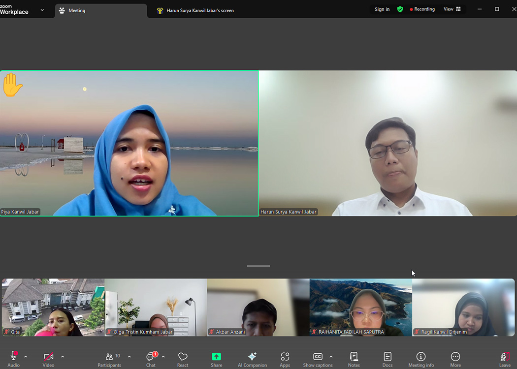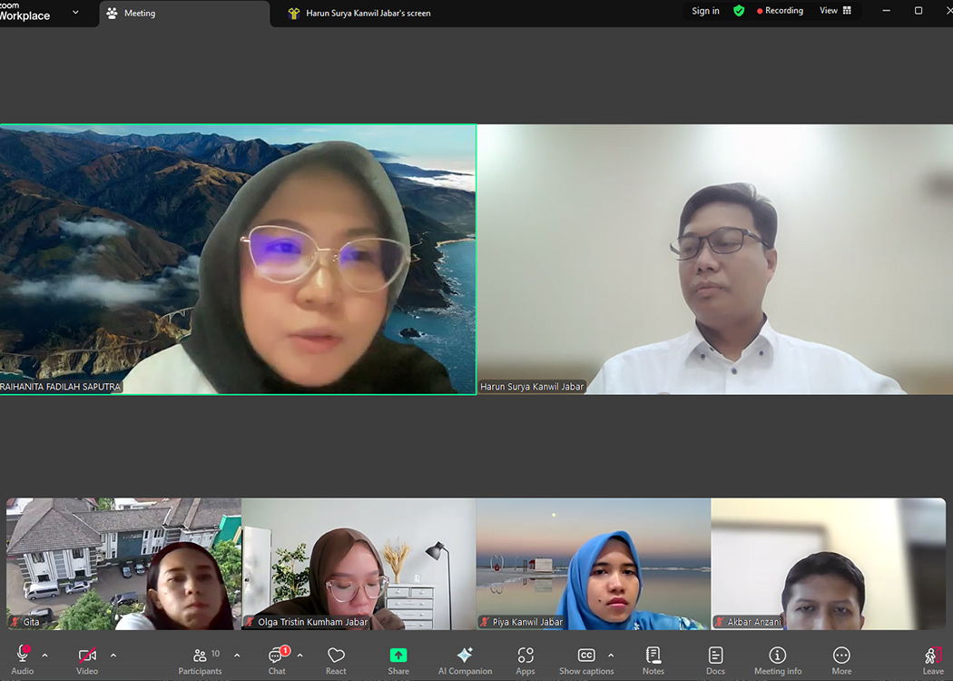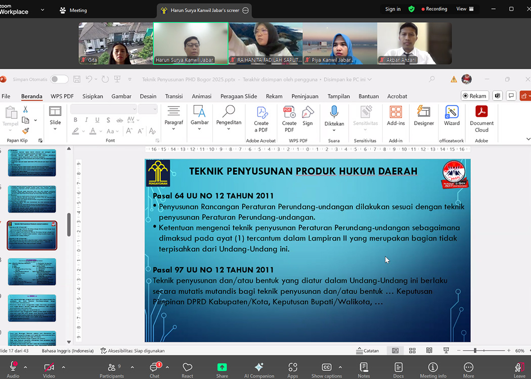 Bandung – Kantor Wilayah Kementerian Hukum Jawa Barat (Kanwil Kemenkum Jabar) pada siang ini mengadakan kegiatan NONGKI SANTAI (Ngobrol Kolaborasi Saling Tukar Ilmu) dengan tema "Teknik Penyusunan Peraturan Perundang-undangan di Tingkat Daerah (Perda dan Perkada)" secara daring melalui Zoom Meeting (Jumat, 22/08/2025).