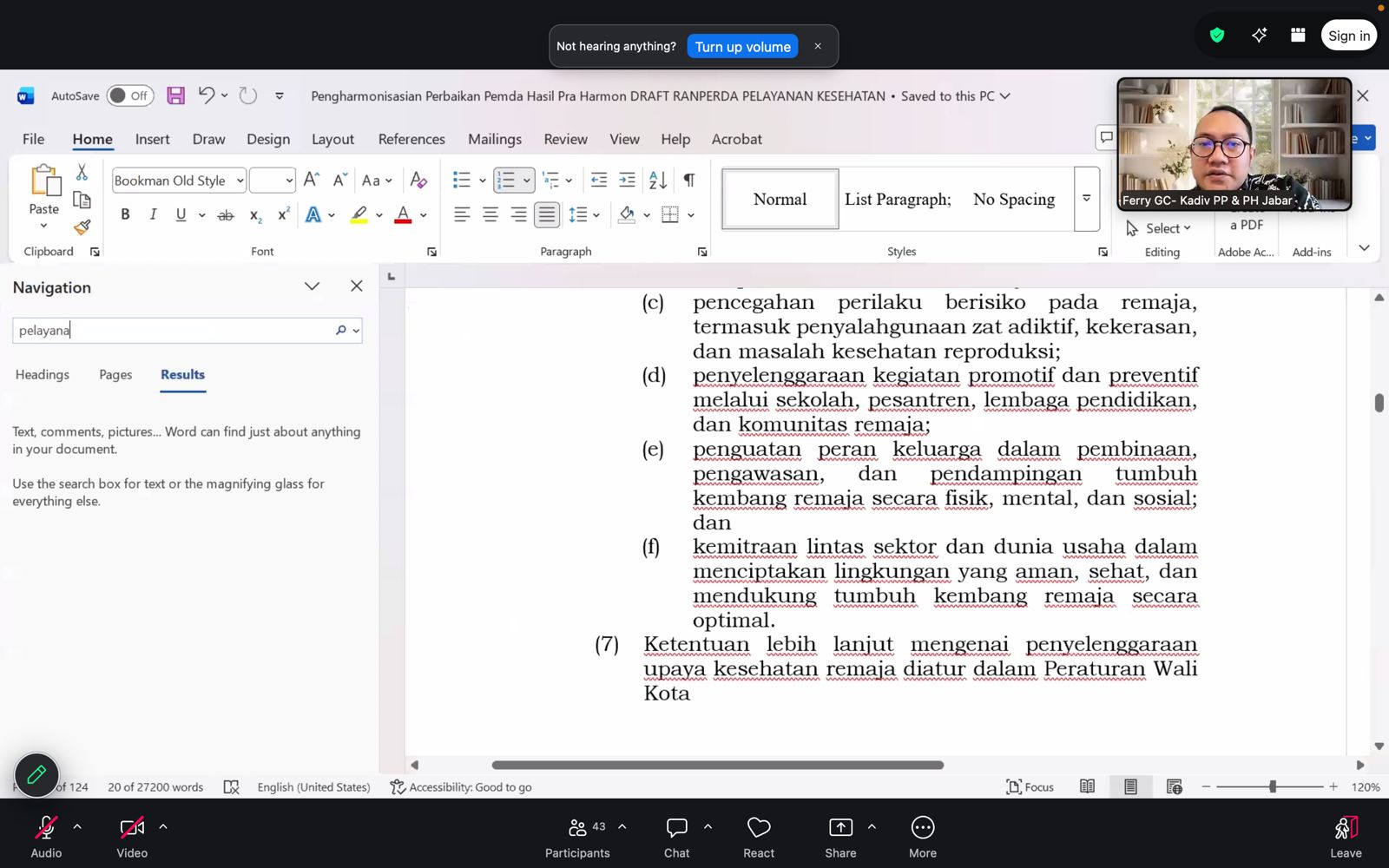 Terkait Raperda Penyelenggaraan Kesehatan, Kemenkum Jabar memberikan catatan penting mengenai perlunya pengkajian ulang Pasal 22 agar selaras dengan UU Nomor 17 Tahun 2023, khususnya terkait tanggung jawab pemerintah dalam transplantasi organ dan terapi berbasis sel. Selain itu, disoroti pula mengenai sinkronisasi aturan fasilitas pelayanan kesehatan dengan PP Nomor 28 Tahun 2024. Sementara itu, pada pembahasan Raperwal Lembaga Kemasyarakatan Kelurahan, Kemenkum Jabar mengingatkan perihal kewenangan penandatanganan naskah dinas agar tetap mengacu pada Perwal Nomor 46 Tahun 2024 tentang Tata Naskah Dinas guna menghindari cacat administratif.