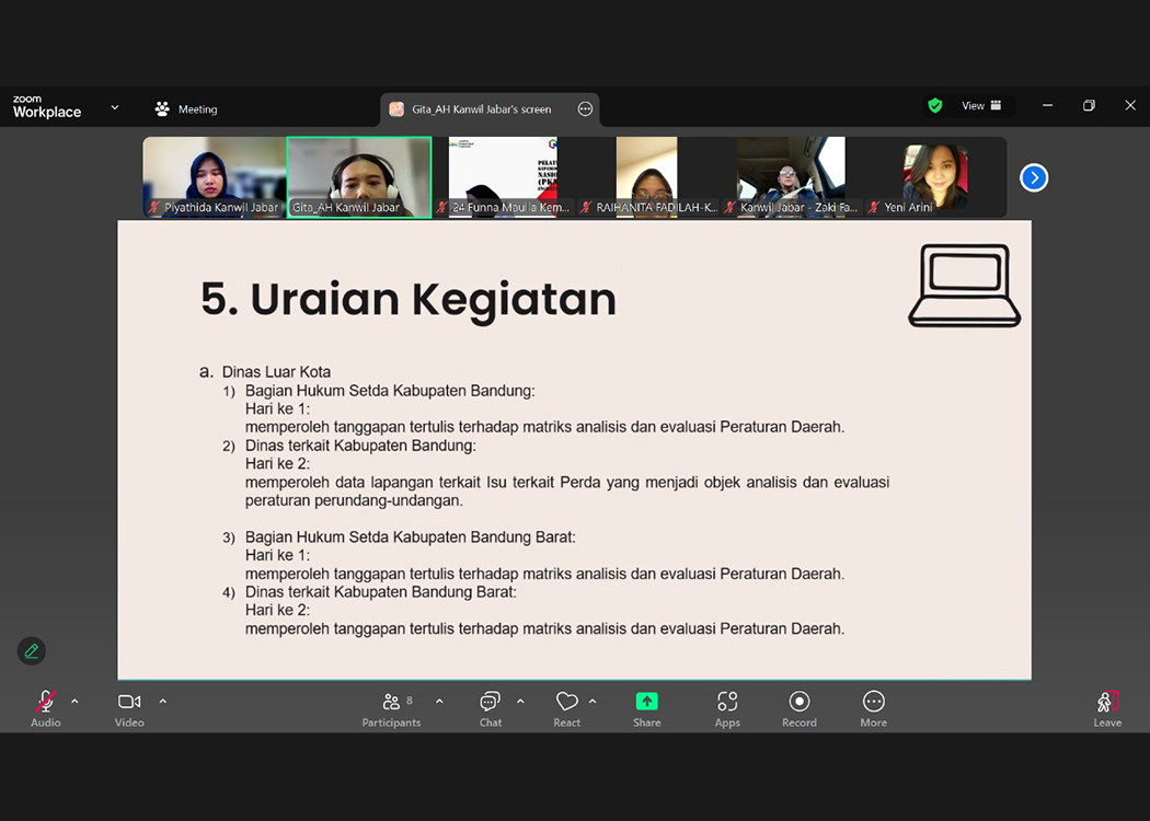 BANDUNG- Sesuai Arahan Kakanwil Kemenkum Jabar, Asep Sutandar, melalui KadivP3H Jabar, Funna Maulia Massaile, dan jajarannya, hari ini, Kamis, 03 Juli 2025, tim kerja Analisis dan Evaluasi Kantor Wilayah Kementerian Hukum Jawa Barat melaksanakan Rapat Pembahasan Rencana Kerja Analisis dan evaluasi Perda Triwulan III.
