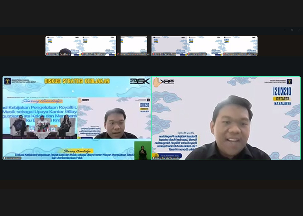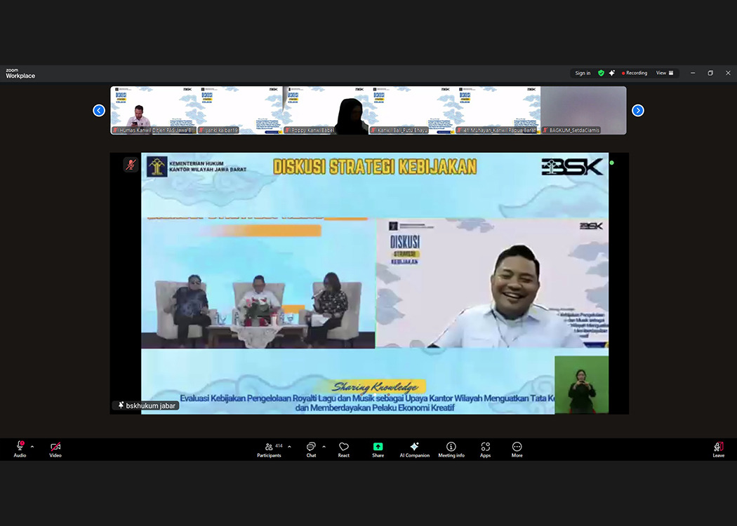 Acara ini dibuka secara resmi oleh Kepala Badan Strategi Kebijakan Hukum, Andry Indrady, yang mengapresiasi relevansi tema yang diangkat oleh Kemenkum Jabar sebagai langkah krusial untuk memastikan kebijakan berdampak bagi masyarakat, “Pengelolaan royalti lagu dan musik tidak hanya penting dalam konteks perlindungan hak cipta, tetapi juga merupakan bagian dari upaya memperkuat ekosistem ekonomi kreatif di Indonesia.” Ungkap KaBSK Kemenkum Jabar.