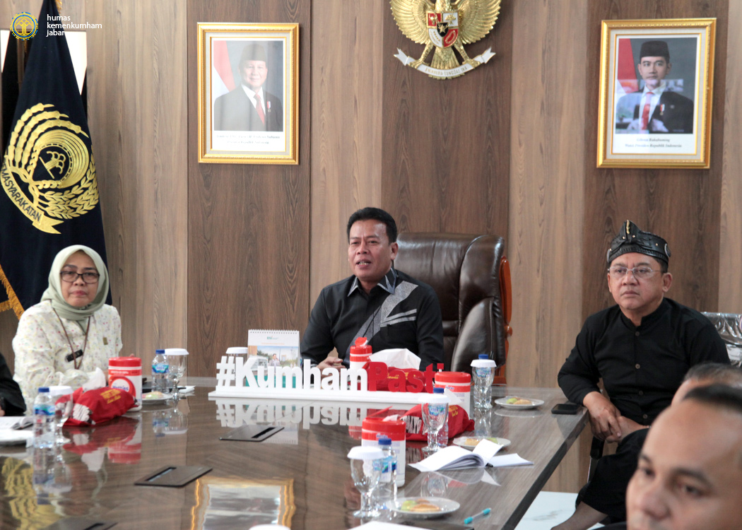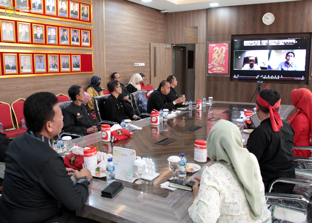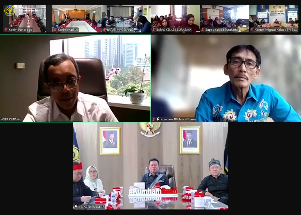 Pada ruang rapat Sahardjo, Kanwil Jabar, Kepala Kantor Wilayah Masjuno beserta Kepala Divisi Administrasi Itun Wardatul Hamro, Kepala Divisi Keimigrasian Filianto Akbar dan para anggota Tim Pokja WBBM Kanwil Jabar menghadiri jalannya pengarahan yang dipimpin oleh Plt. Sekretaris Jenderal Asep Kurnia.