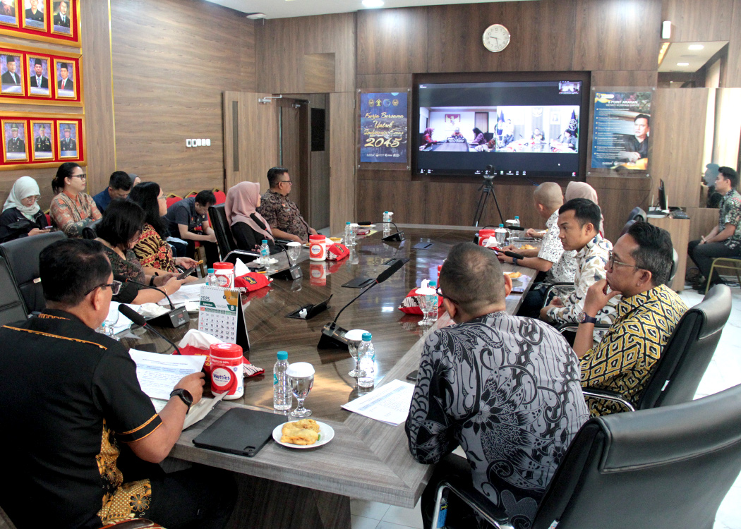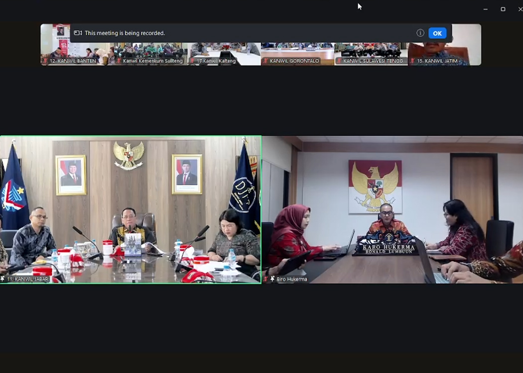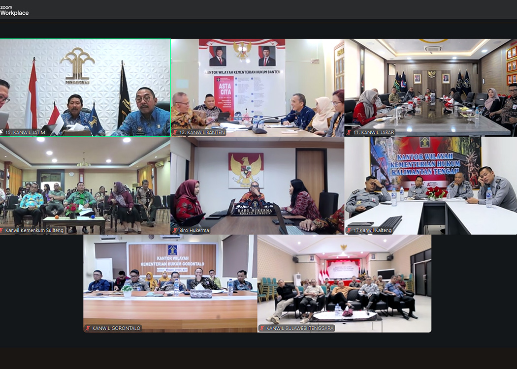 Dari ruang rapat Sahardjo, Kanwil Jabar, Kepala Kantor Wilayah Asep Sutandar bersama Kepala Divisi Pelayanan Hukum Hemawati BR Pandia, Kepala Bagian Umum & TU Archie Tigor Mangunsong mengikuti Rapat Koordinasi yang dipimpin oleh Kepala Biro Hukerma Ronald Lumbuun dan diikuti oleh Kanwil Kemenkum Banten, Kanwil Jatim, Kanwil Kalteng, Kanwil Gorontalo, Kanwil Sulawesi Tengah, serta Kanwil Sulawsi Tenggara.