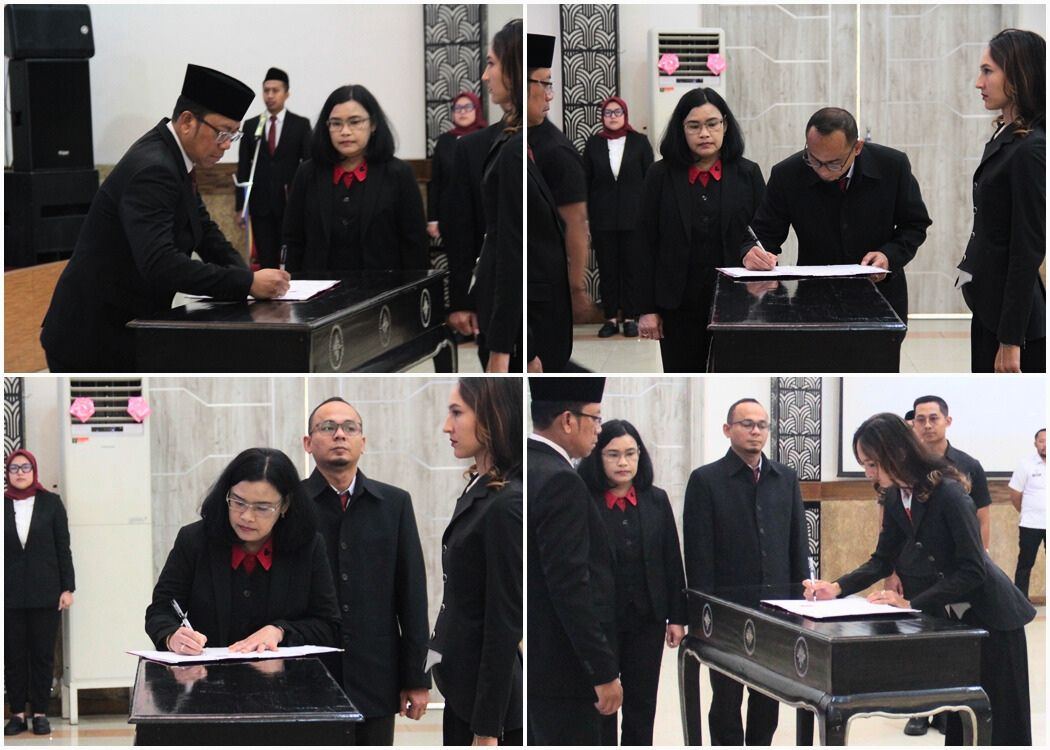 Kakanwil Kemenkum Jabar tersebut berharap seluruh pihak yang dilantik dapat menjunjung tinggi kejujuran dan integritas dalam menjalankan tugasnya, karena hasil pekerjaan yang baik merupakan kontribusi berharga bagi pembangunan bangsa dan negara. Kegiatan berlangsung khidmat dan diakhiri dengan pemberian ucapan selamat kepada para pihak yang telah resmi mengemban status dan jabatan barunya.