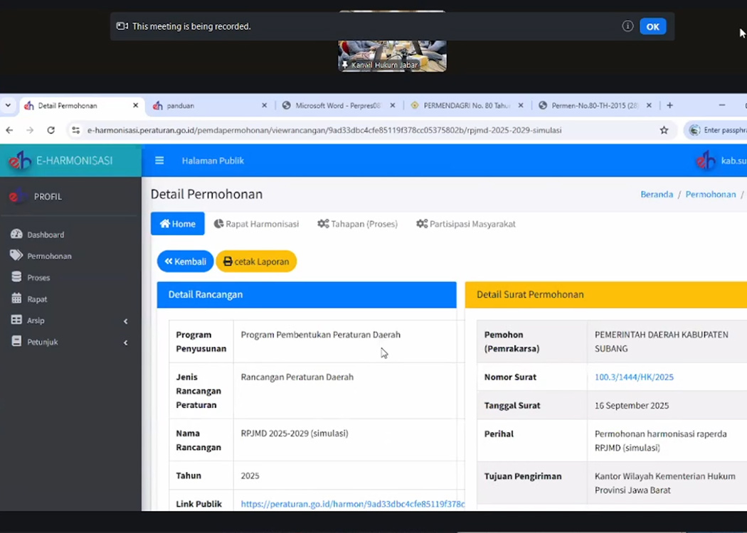 Selanjutnya dalam pemaparan materi oleh Perancang PUU Kanwil Jabar Erdian, disampaikan mengenai pengenalan pengenalan fungsi aplikasi e-Harmon serta langkah – langkah penggunaan aplikasi tersebut kepada para peserta yang hadir secara langsung dan virtual.