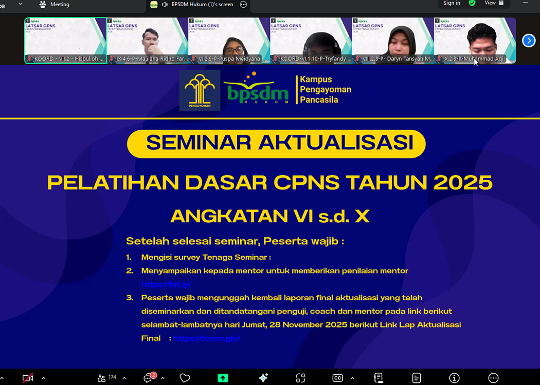 Seminar Aktualisasi ini merupakan bagian akhir dari rangkaian kegiatan Pelatihan Dasar (Latsar) CPNS dengan Metode Distance Learning yang diselenggarakan oleh Badan Pembinaan Sumber Daya Manusia (BPSDM) Hukum Kemenkum RI dan diikuti oleh seluruh CPNS Kemenkum tahun 2025 se-Indonesia.