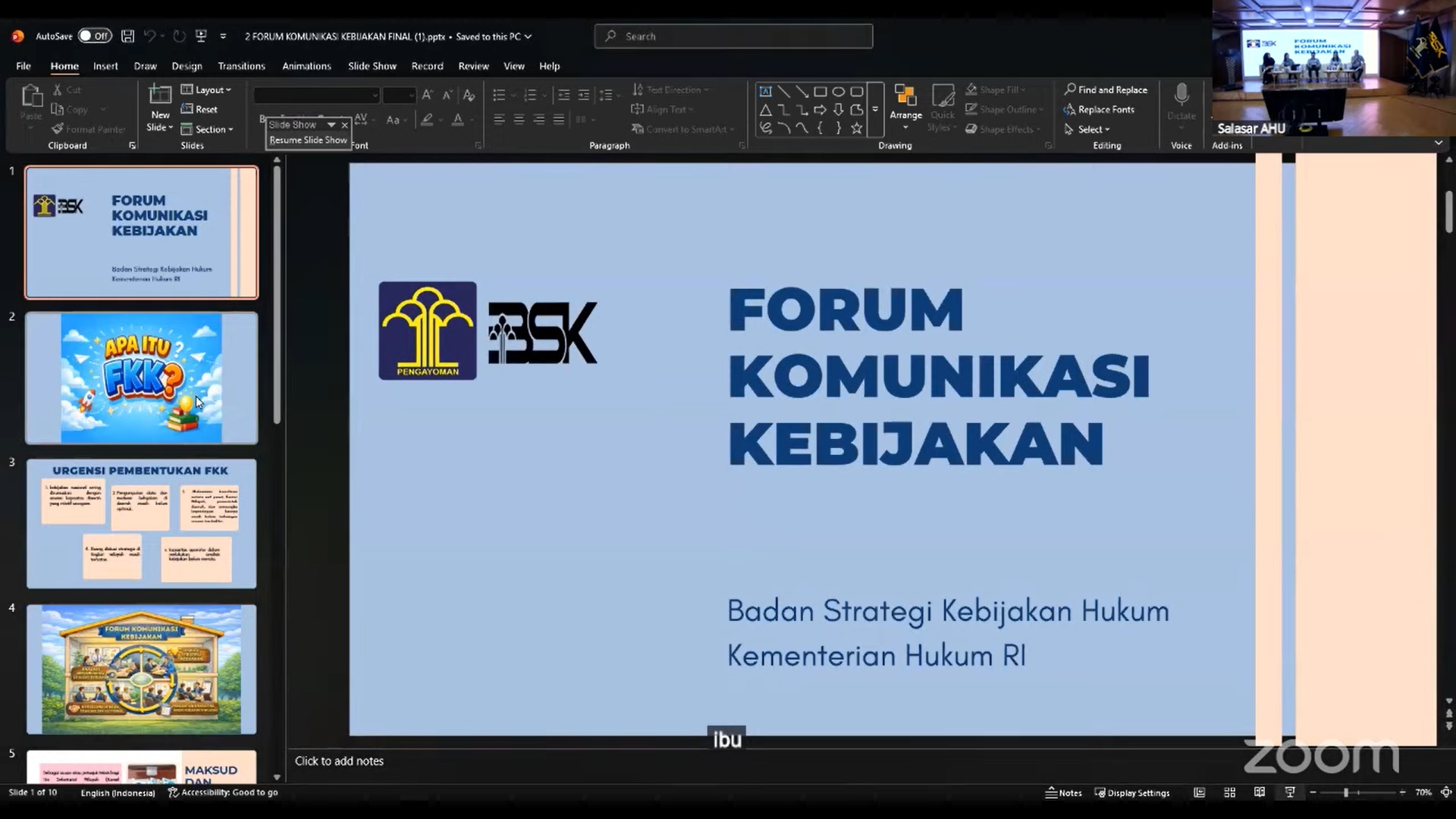 Dalam sesi pemaparan teknis, para narasumber menjelaskan rincian mengenai pelaksanaan kegiatan di wilayah sepanjang tahun 2026. Pak Sudjatmiko memaparkan mengenai mekanisme FKK yang mengedepankan kolaborasi dengan pemerintah daerah dan perguruan tinggi, sementara Farah Anissa Rahab menjelaskan mengenai Analisis Implementasi dan Evaluasi Kebijakan (AIK) yang pada tahun ini memiliki luaran baru berupa Policy Brief. Dukungan Kemenkum Jabar di bawah pimpinan Asep Sutandar diharapkan dapat memaksimalkan pemanfaatan aplikasi Legal Policy Hub sebagai repositori hasil analisis kebijakan. Melalui sosialisasi ini, Kemenkum Jabar siap menyinergikan program kerja di wilayah guna menghasilkan rekomendasi kebijakan yang berkualitas, akuntabel, dan memberikan kontribusi nyata bagi masyarakat di Jawa Barat.