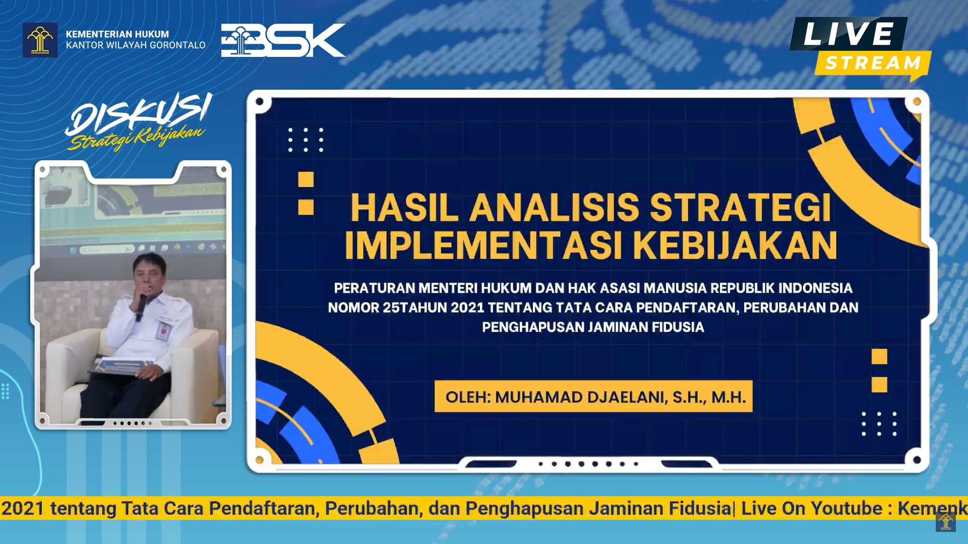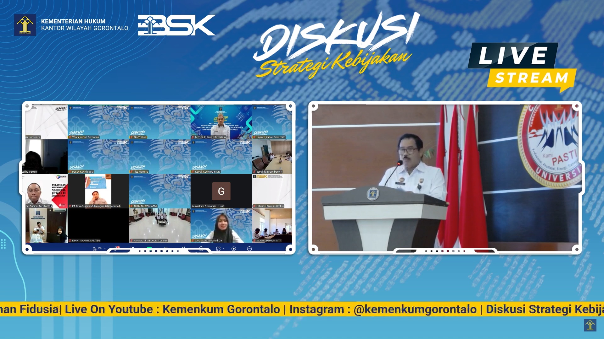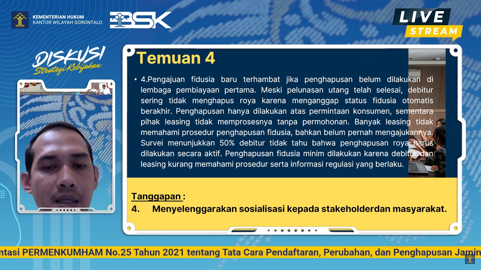 Kegiatan ini dibuka secara resmi oleh Kepala Badan Strategi Kebijakan Hukum Kemenkum RI, Andre Indradi, dan dihadiri oleh berbagai pihak, termasuk Dekan Fakultas Hukum Universitas Gorontalo Dr. Yusrianto Kadir, perwakilan lembaga pembiayaan, serta para notaris se-Provinsi Gorontalo. Dalam diskusi terungkap bahwa banyak debitur tidak mengetahui kewajiban untuk melaporkan pelunasan utang agar jaminan fidusianya dihapus dari sistem Administrasi Hukum Umum (AHU) Online. Hal ini diperparah dengan belum terintegrasinya sistem AHU Online dengan sistem internal lembaga pembiayaan atau leasing.