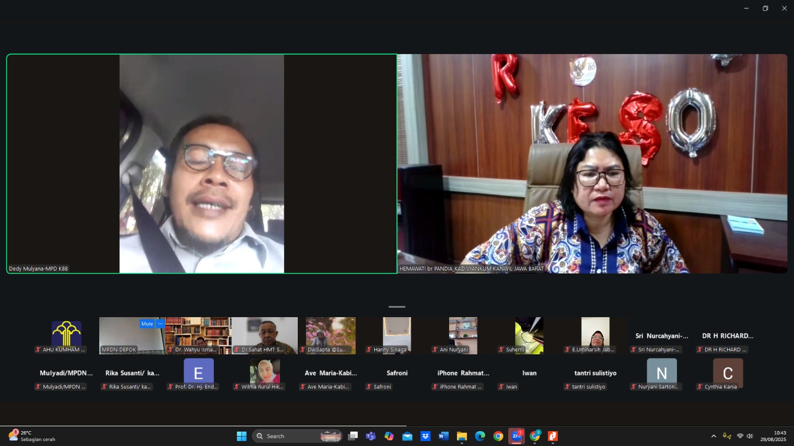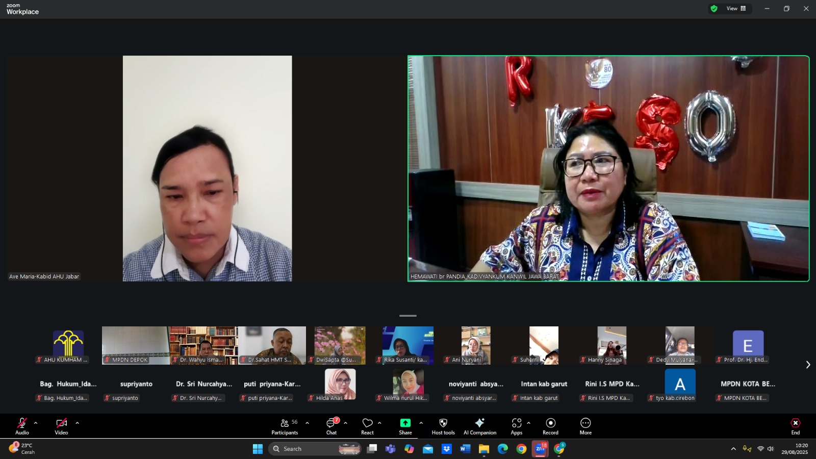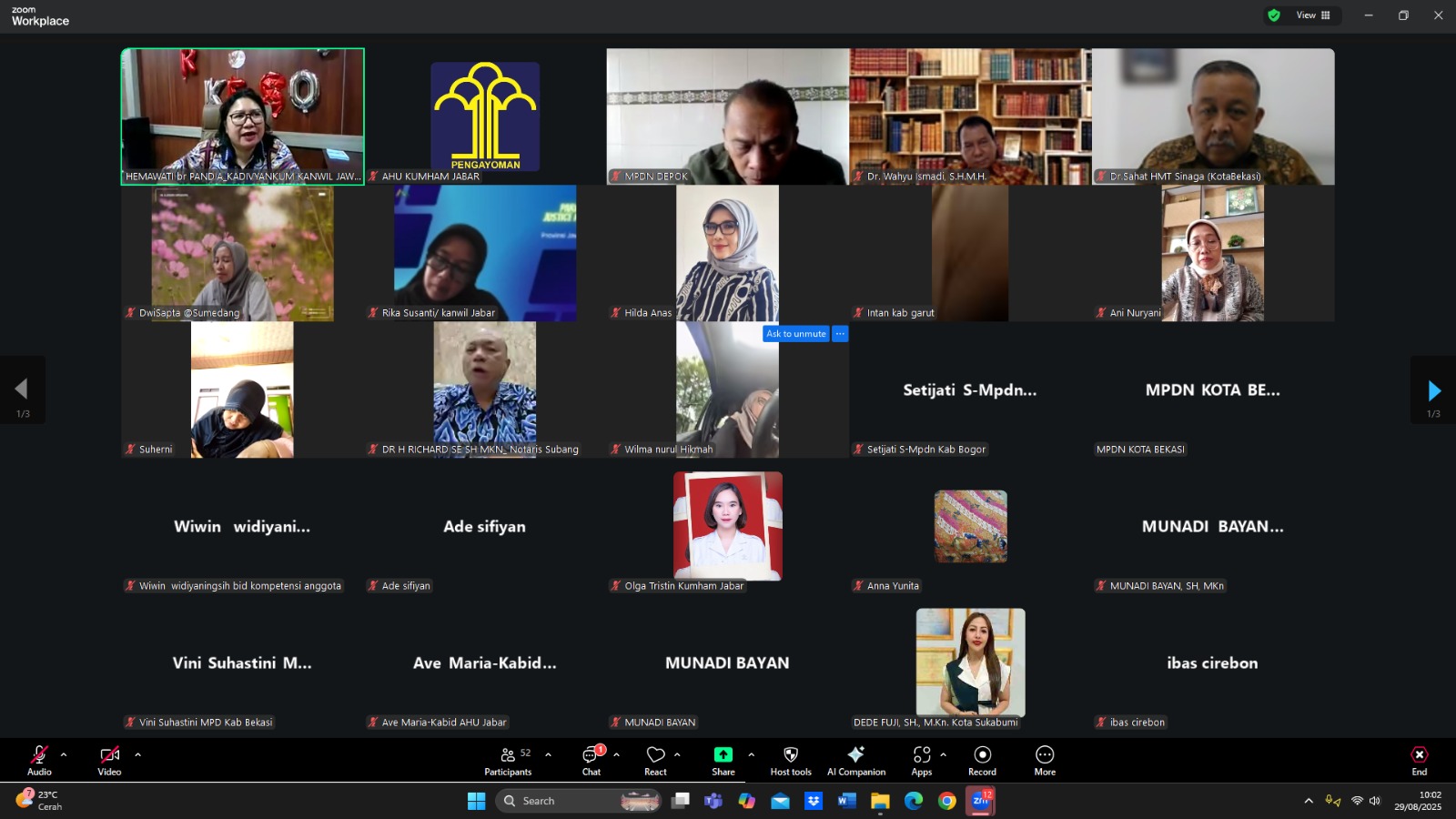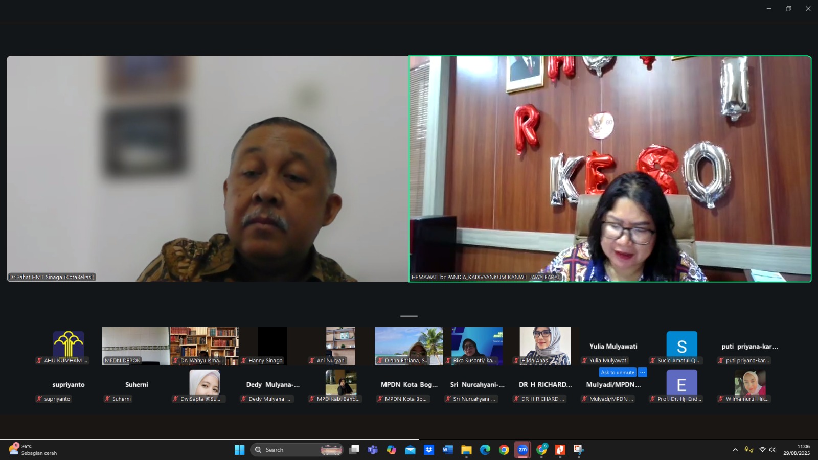 BANDUNG – Kantor Wilayah Kemenkum Jawa Barat menggelar Rapat Pembinaan dan Pengawasan Notaris/PPAT secara virtual pada Jumat, 29 Agustus 2025. Kegiatan ini merupakan bagian dari komitmen Kepala Kantor Wilayah Kemenkum Jawa Barat, Asep Sutandar, untuk terus meningkatkan kualitas, profesionalisme, dan ketertiban administrasi para notaris yang berada di bawah pengawasannya. Rapat yang dipimpin langsung oleh Kepala Divisi Pelayanan Hukum, Hemawati BR Pandia, ini dihadiri oleh Kepala Bidang Pelayanan Administrasi Hukum Umum, Ave Maria Sihombing, serta seluruh anggota Majelis Pengawas Daerah (MPD) Notaris dari berbagai kabupaten/kota di Jawa Barat.