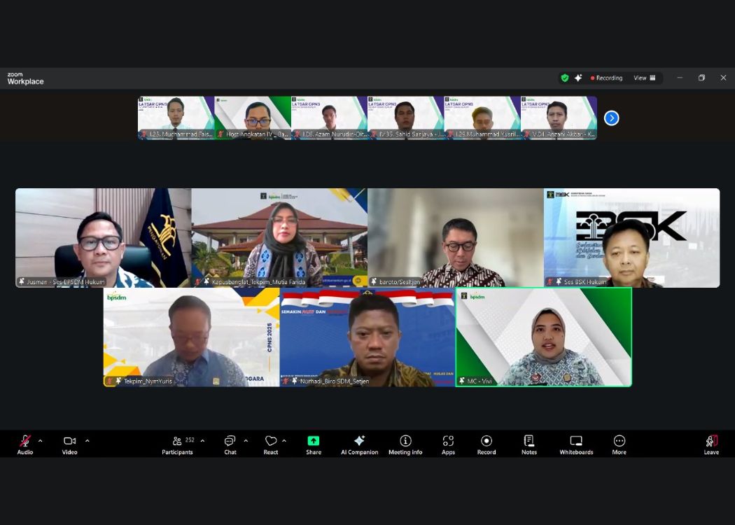 BANDUNG – Kanwil Kemenkum Jabar, melalui Tim Kerja Kepegawaian dan CPNS turut serta dalam kegiatan Penutupan Pelatihan Dasar (Latsar) Calon Pegawai Negeri Sipil (CPNS) Gelombang 1 Tahun Anggaran 2025 yang digelar secara virtual pada hari Jumat, 14 November 2025. Kegiatan ini diselenggarakan oleh Badan Pengembangan Sumber Daya Manusia (BPSDM) Hukum dan diikuti melalui media telekonferensi Zoom Meeting dari masing-masing satuan kerja.